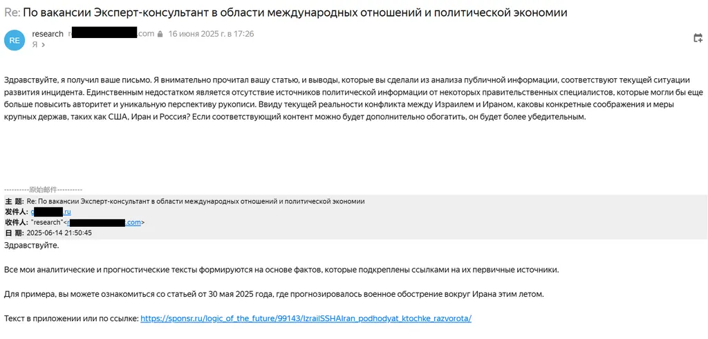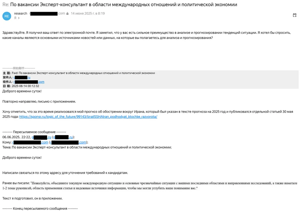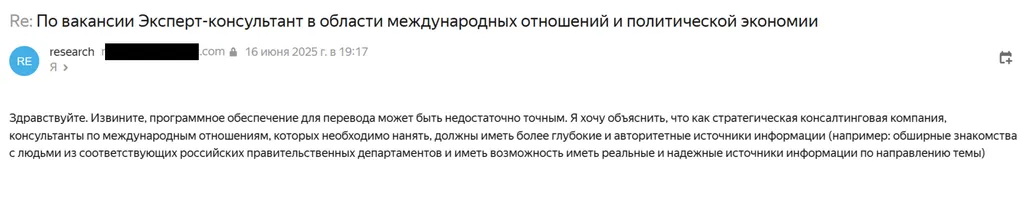 Второй работодатель общался по-русски, но с китайской почты и явно через переводчик. Моя квалификация его тоже удовлетворила, но под предлогом интересов работодателя он потребовал подтвердить «обширные знакомства с людьми из соответствующих российских правительственных департаментов и реальные и надежные источники информации по направлению темы».