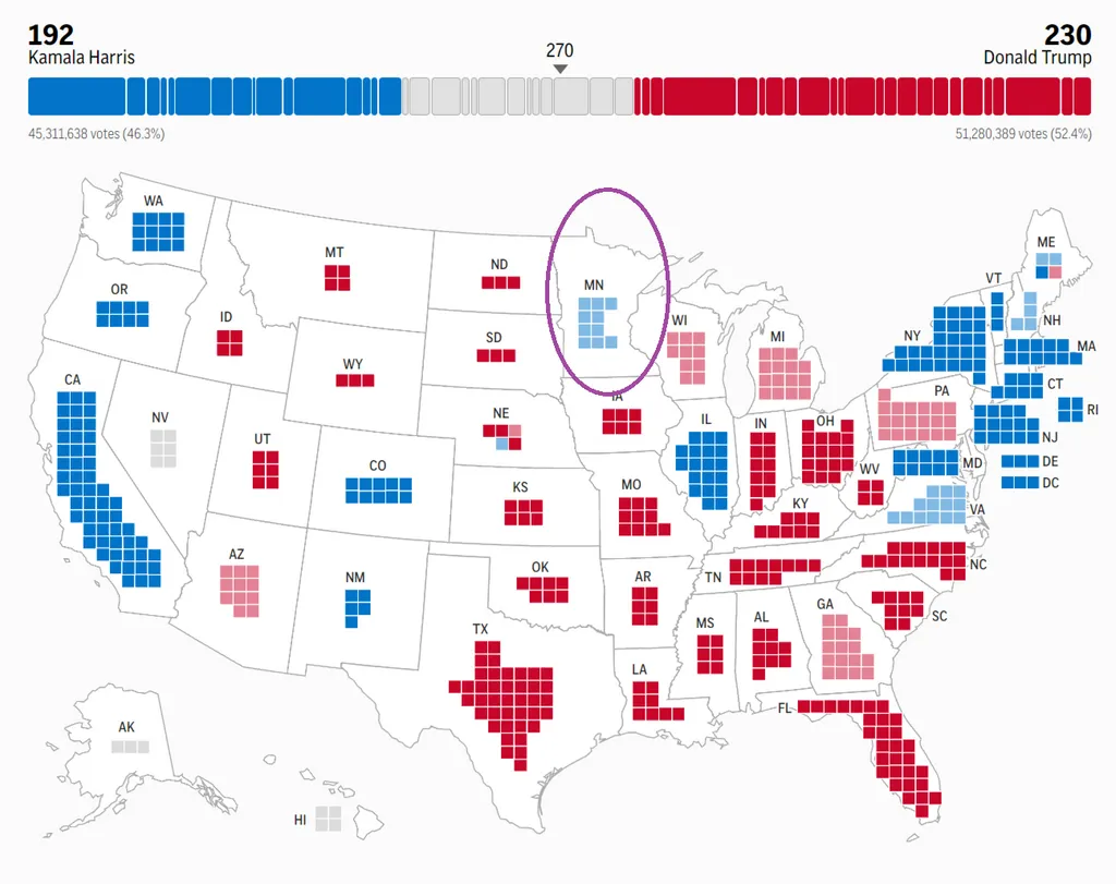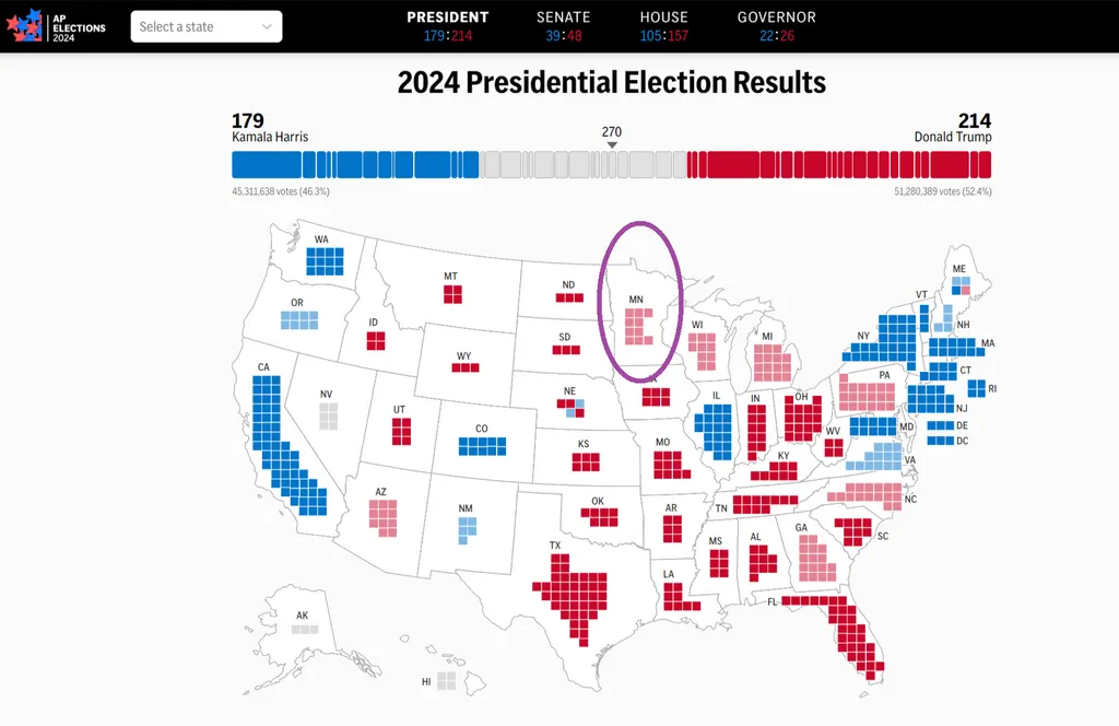 Кроме того «электоральные сюрпризы» в ходе выборов все же были. Так как штат Миннесота, на карте выборов Associated Press первоначально был за республиканцами с 30% отрывом, но через 20 минут «перешел на сторону» демократов с отрывом в 8%.