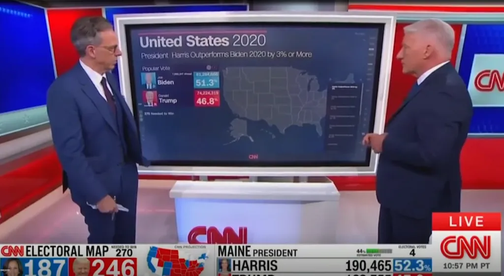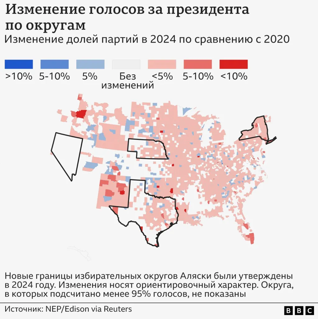 Демпартия оказалась не готова к такому результату. Вот так выглядит инфографика CNN по штатам, где на выборах Харрис набрала на 3% больше (уровень чуть выше статистической погрешности) чем Байден в 2020 году.