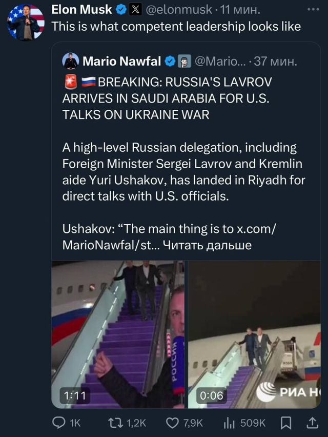 Посмотрите на твит Илона Маска: «Вот так выглядит компетентное лидерство», так он прокомментировал прибытие делегации России в Эр-Рияд.