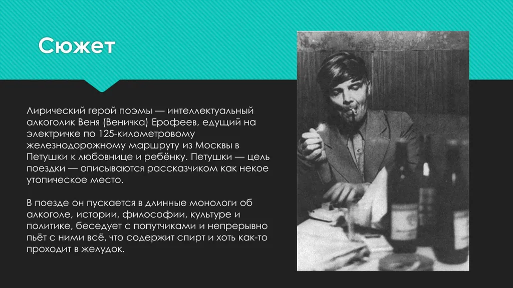 Роман «Москва-Петушки» часто рассматривают как художественный экзистенциализм с антигероем, то есть алкоголиком, который ищет смысл и свободу, но сталкивается с непреодолимым цинизмом и «постановкой» реальности.