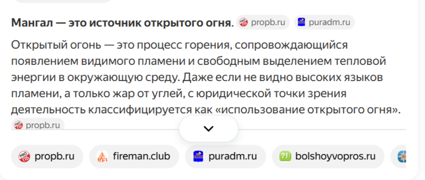 Нормальный человек спрашивает у яндекса "Мангал это открытый огонь или нет".