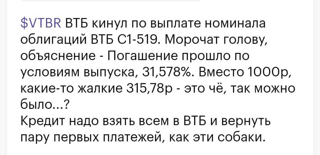 Я считаю, что среди моих читателей, а, особенно, подписчиков платных проектов, таких не было и не могло быть, ибо разбирал подобные вещи (к примеру, тут: ЦФА от «Альфа-Банка». 40% годовых гарантировано! Не ожидал от Альфы. | MarketScreen | Sponsr) и обращал не один раз самое пристальное внимание на доходности, которые рисуются на информационных финансовых сервисах. Обращал внимание на то, что смотреть эти доходности нельзя. Нет, они не врут-врут. Их просто надо понимать. И сейчас я всё объясню еще раз на примере структурной облигации ВТБ-С-1-519, которую эмитент погасил полторы недели тому назад по цене 32% (примерно) от номинала. И все ахерели.