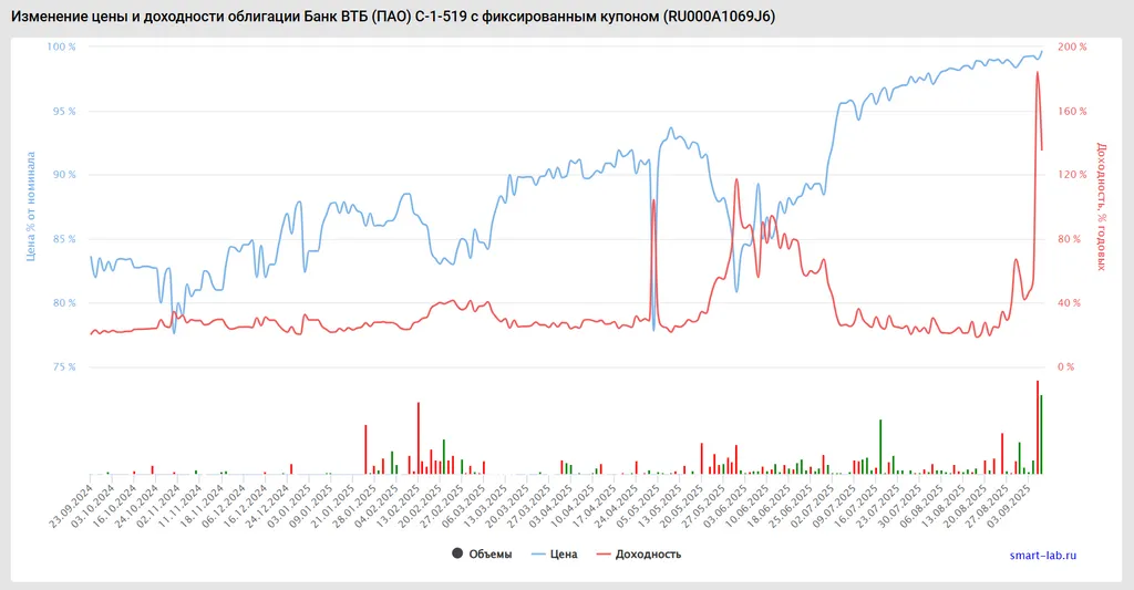 Смотрите, приходит такой «инвестор» на рынок в начале сентября и видит облигацию банка ВТБ, которая стоит 99% от номинала и гасится через условные 5 дней.