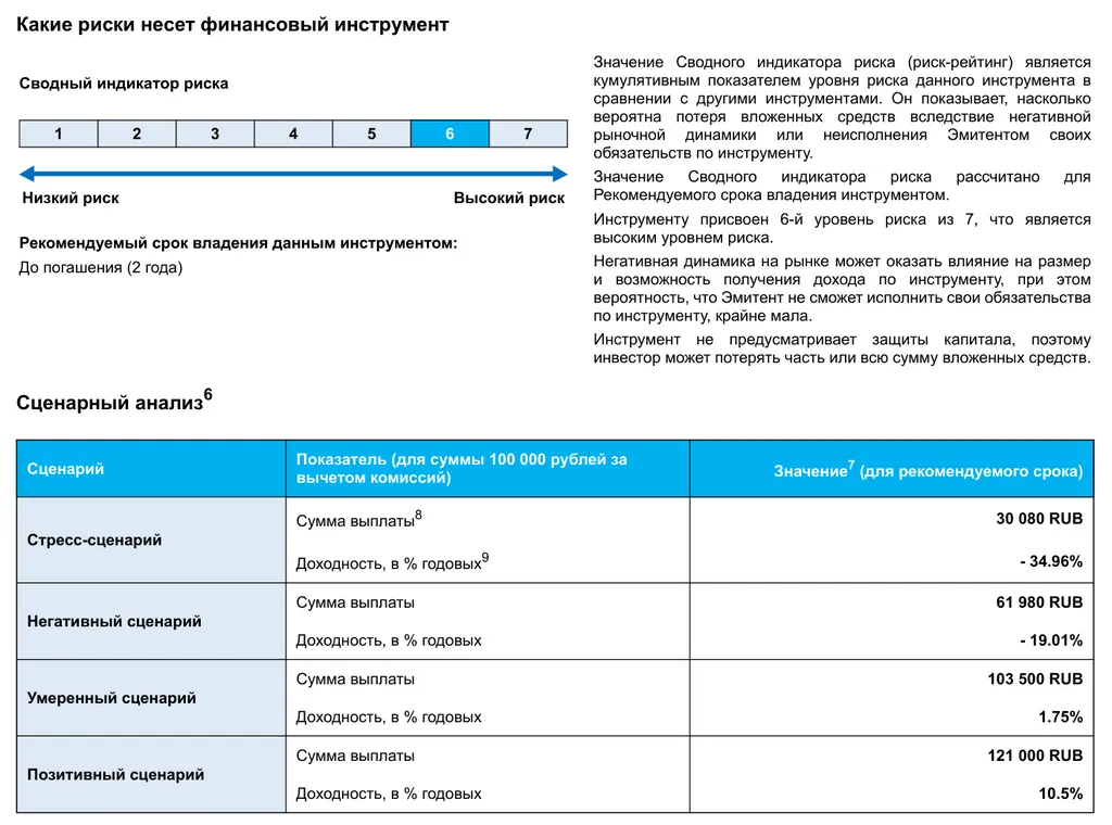 Это крайне рисковый инструмент, о чём эмитент говорит даже картинками! Чтобы было видно хорошо. Эмитент говорит, что даже в базовом сценарии развития событий доходность ваша составит 1,75% годовых. А при плохом вы потеряете 35%.