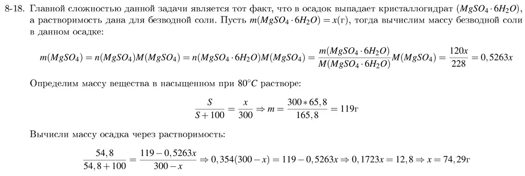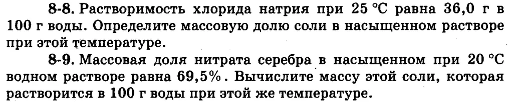 8-8. Растворимость показывает массу вещества, растворяющегося при заданной температуре в 100г воды с образованием насыщенного раствора. Следовательно масса раствора будет составлять (S+100), что позволяет вычислить массовую долю вещества в растворе: