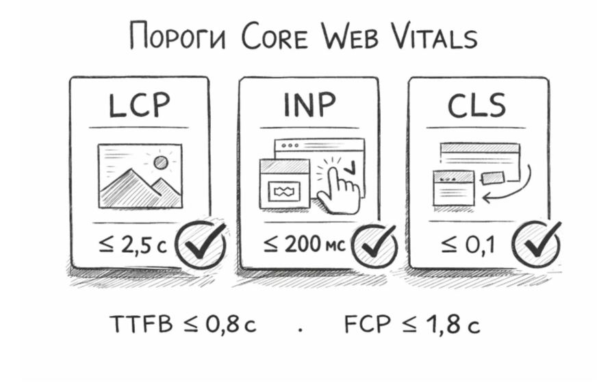 Критерии хорошей скорости — это пороговые значения, по которым можно понять, загружается сайт быстро или уже есть задержки, заметные пользователям и важные для SEO. Оценка проводится по 75-му процентилю пользователей, а не по лучшему или худшему сценарию. Это означает, что сайт должен быть быстрым для большинства посетителей, а не только в идеальных условиях.