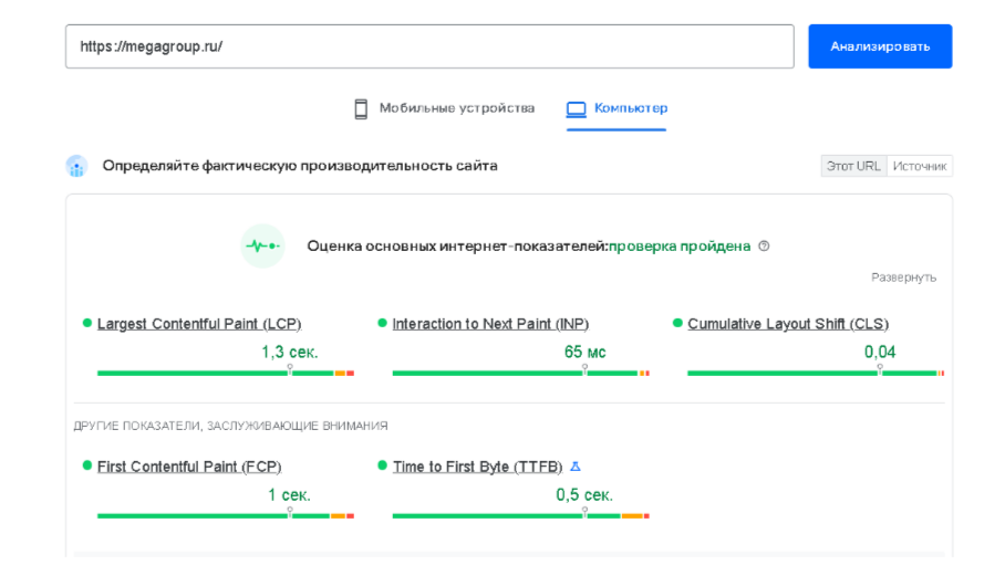 - Проверить ключевые метрики скорости — LCP, INP и CLS в PageSpeed Insights и в отчете Core Web Vitals. Это поможет убедиться, что изменения улучшили пользовательский опыт.