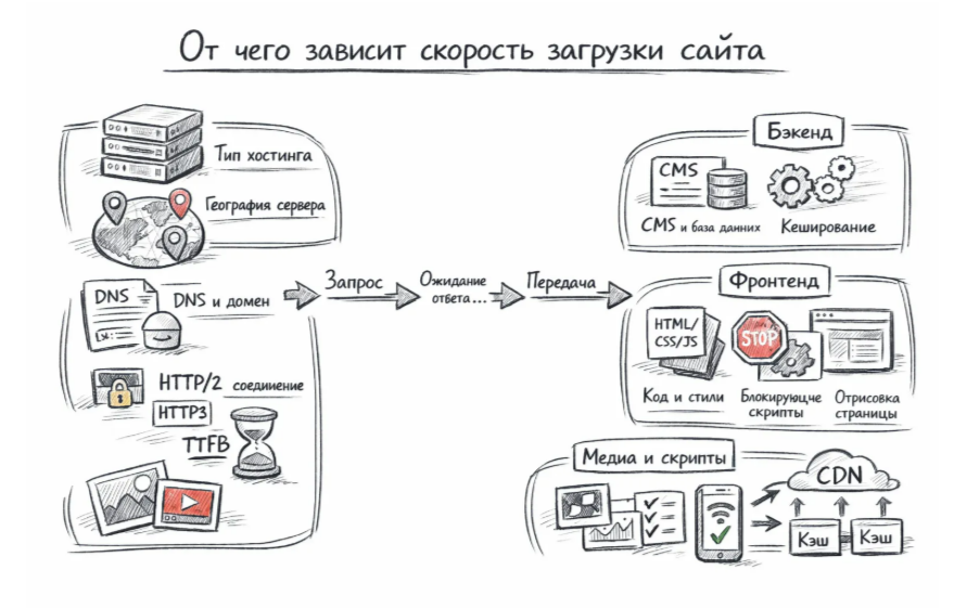 Скорость загрузки сайта формируется цепочкой технических решений — от сервера и сети до фронтенда и сторонних скриптов. Если смотреть только на итоговые баллы в тестах, легко начать «чинить симптомы», не затрагивая реальные причины замедления. Чтобы сайт стабильно работал быстро и не деградировал со временем, важно понимать, где возникают задержки и почему.