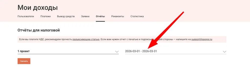 - Дата дохода: учитывайте на дату поступления денег на счет платформы Sponsr, а не на счет ИП. Можно указывать одну дату — последнее числе месяца или квартала.