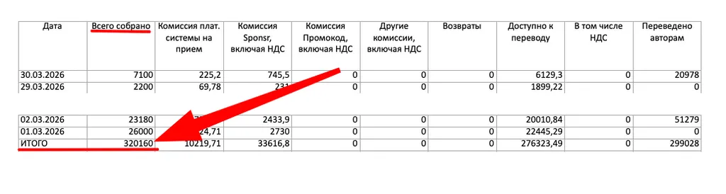 - Сумма дохода: вся сумма платежей подписчиков («Всего собрано» в отчете).