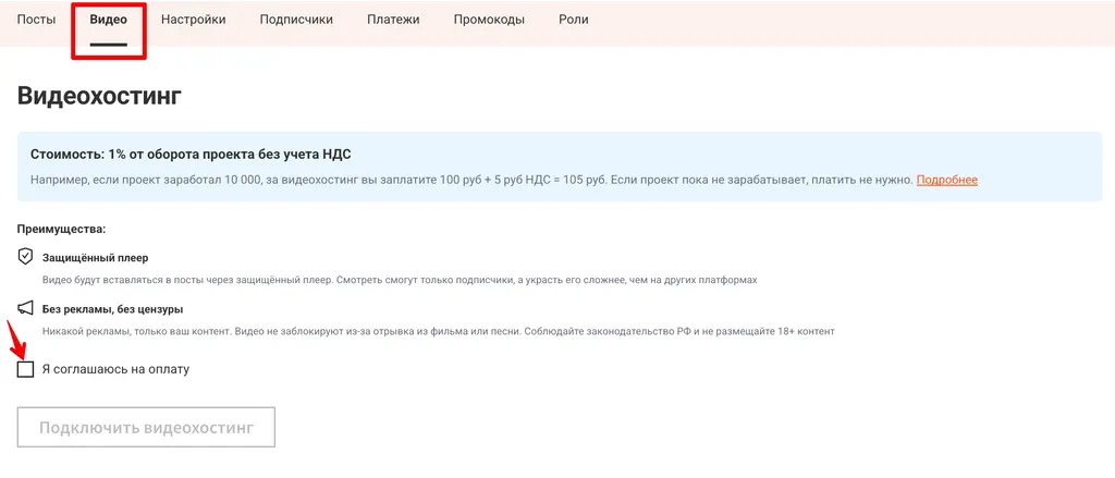 В этом разделе автор может подключить наш внутренний видеохостинг от компании Kinescope. На данный момент комиссия за его использование составляет 1%. С 1 апреля 2026 года комиссия поднимается на 0,5%. С нашим хостингом автор может загружать ролики заранее и при создании публикации выбирать видео из библиотеки.