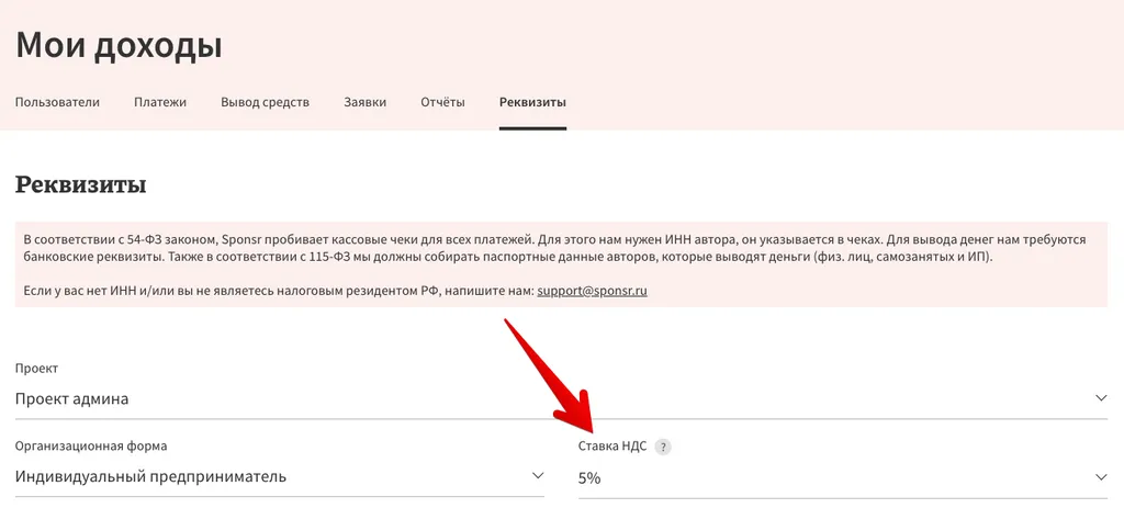 Если ваша компания или ИП, на которую зарегистрирован проект в Sponsr, должна платить НДС, то вам необходимо указать это в настройках. Мы не можем это сделать за вас, потому что НДС зависит от величины годового оборота, но не весь оборот вашей компании проходит через Sponsr.