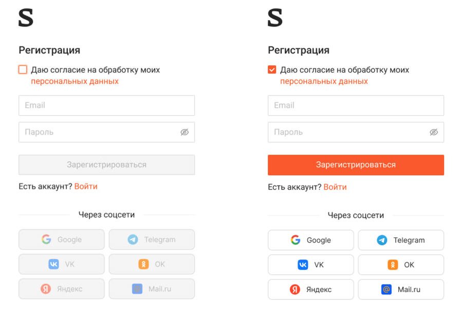 Зарегистрироваться на платформе можно на странице регистрации. Регистрация возможна по паре почта + пароль или через профиль в одной из доступных соц.сетей. Необходимо поставить флажок о согласии на обработку персональных данных.