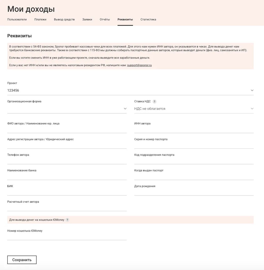 Для запуска проекта достаточно указать ИНН автора, но для вывода понадобится указать более полные данные. Для этого необходимо заполнить все обязательные поля на странице Реквизиты (Мои доходы - Реквизиты в основном меню сайта).