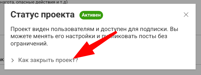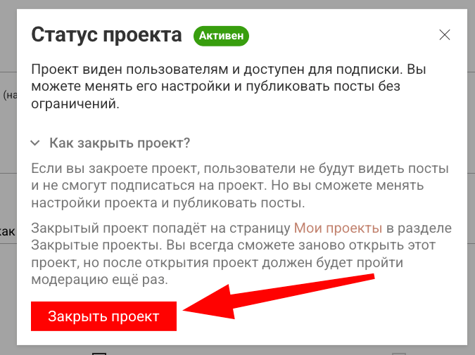 В открывшемся окне вы увидите описание статус и возможность закрыть проект.