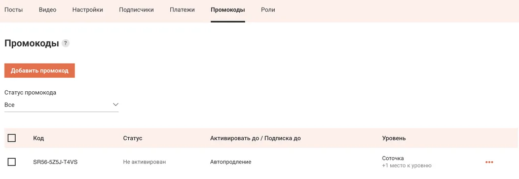 +1 место к уровню — даёт подписчику возможность подписаться на уровень с ограниченным количеством мест, когда места закончились. Этот тип промокода не открывает доступ к постам уровня. Такой промокод бесплатен и для автора, и для пользователя. Промокод подходит для более опытных авторов.