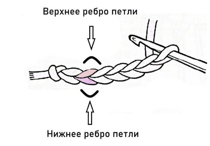 Перед вами косичка из воздушных петель. Я выделила одну петлю, с каждой стороны которой, дуга. Как вы видите, сверху — заднее ребро, спереди — переднее, вот также эти дуги и изображаются на схемах, но над ними ещё значок любого столбика. Например так: