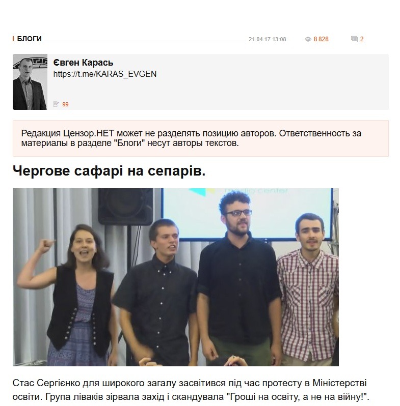 Так, левый активист Станислав Сергиенко несколько раз подвергался нападениям в связи со своей позицией. В 2016 году он был избит представителями «Азова»*, а в апреле 2017 — тяжело ранен ножевыми ударами в Киеве. Перед этим он получал угрозы от ультраправых. Во время нападения у Сергиенко ничего не отобрали, зато сняли происходящее на видеокамеру. Вскоре Евгений Карась, представитель «С14»*, с удовольствием опубликовал текст с формулировкой: «Стасику порезали ноги». Сама статья называлась «Очередное сафари на сепаров».