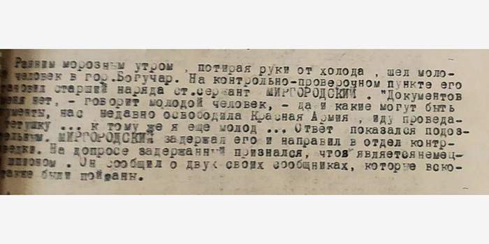 Ранним морозным утром, потирая руки от холода, шел молодоей человек в город Богучар. На контрольно-проверочном пункте его остановил старший наряда старший сержант Миргородский. «Документов у меня нет, — говорит молодой человек, — да и какие могут быть документы, нас недавно освободила Красная Армия, иду проведать тетушку… к тому же, я еще молод». Ответ показался подозрительным. Миргородский задержал его и направил в отдел контрразведки. На допросе задержанный признался, что является немецким шпионом. Он сообщил о двух своих сообщниках, которые вскоре были пойманы.