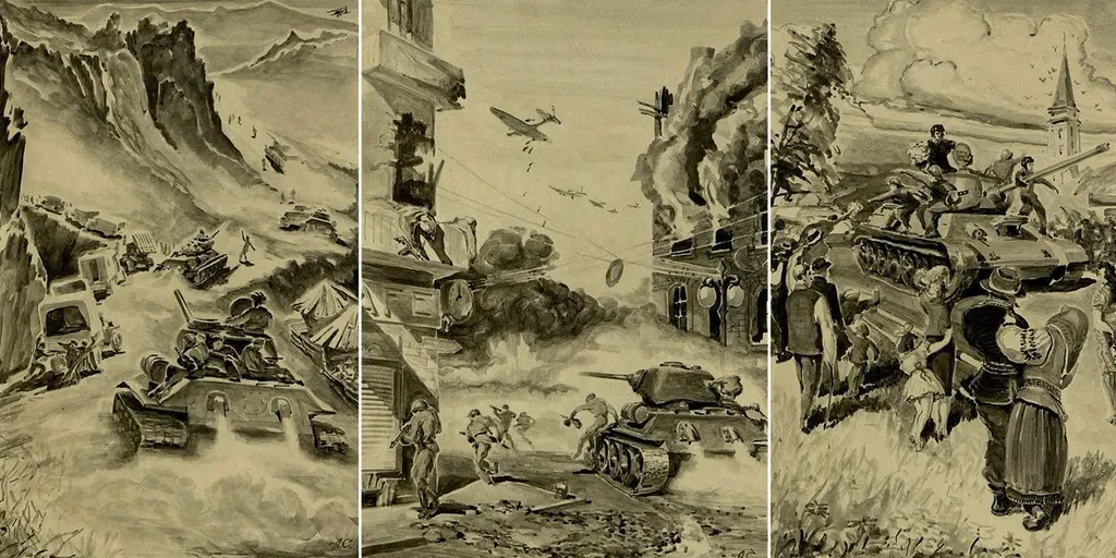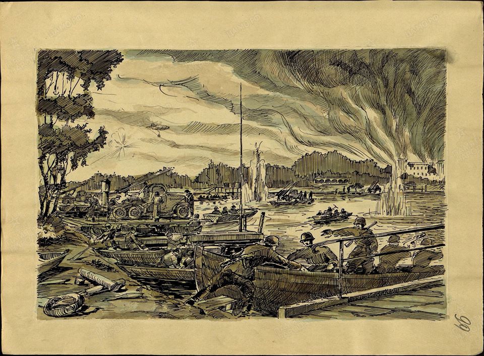 Пятый механизированный — затем 9-й гвардейский механизированный — корпус, помотало по фронтам. Корсунь, Днестр, Румыния, Венгрия, Вена, Чехословакия, а затем Хинган на Дальнем Востоке. Так что на некоторых рисунках из его «боевой истории» можно найти прямо-таки колониальную экзотику. Да и автор текста не чужд лирики и не чурается мелких тактических эпизодов. Скажем, описание захвата пленного разведдозором сопровождается фразой: «Гитлеровец бежал быстро, да и страх подгонял его».