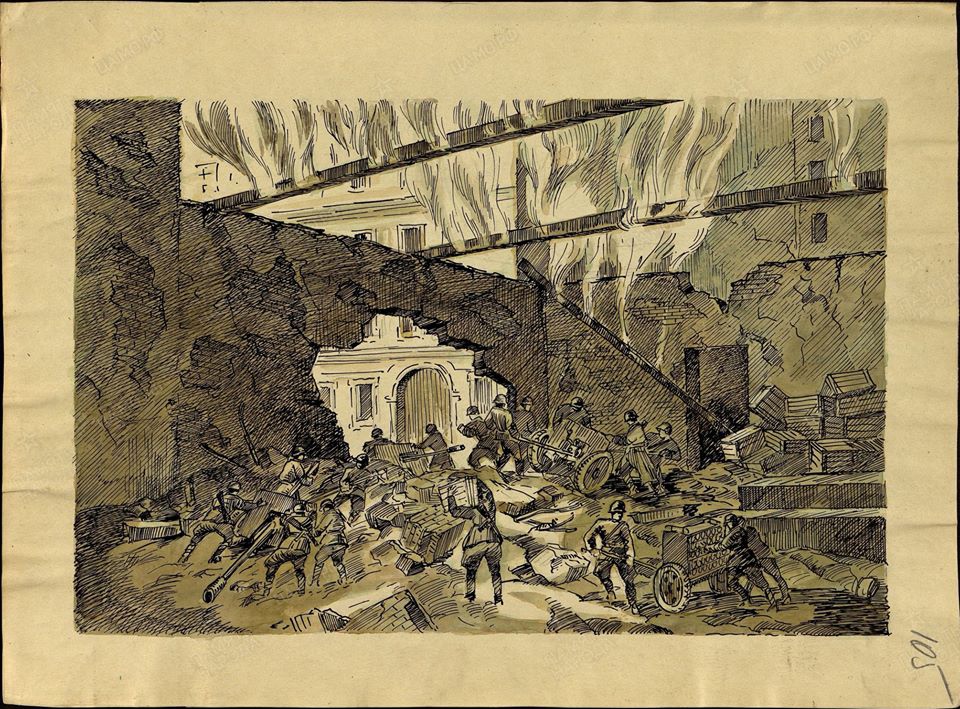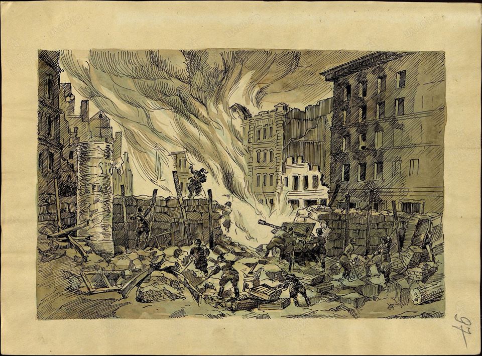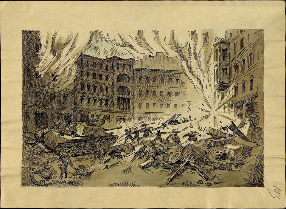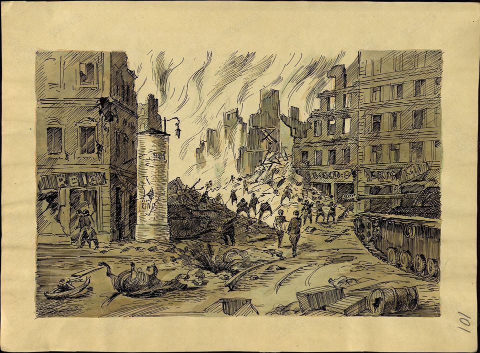 Однако первое место мы всё же должны отдать истинному чемпиону — 17-й штурмовой инженерно-сапёрной бригаде. Семнадцатая шисбр дралась под Выборгом, наступала под Нарвой, освобождала Польшу, штурмовала Берлин — короче говоря, сапёрам было что рисовать. Ученики Гюстава Доре из 17-й штурмовой сходу берут приз редакционных симпатий. Это настоящий боевик на страницах журнала боевых действий.