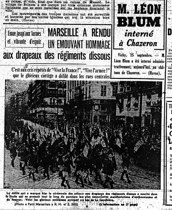 Между тем, люди на фотографии вполне известны по именам. Это Жером Барзотти и его жена Шарлотта. Фотографию сделал 15 сентября 1940 года в Марселе местный фотограф Марсель де Ренцис. В этот день знамена расформированных французских полков вывозились в Алжир через Марсель. Барзотти в войне не участвовал по уважительной причине (ему было уже 50). И, конечно, за кадром никаких немцев нет — французы провожают своих, а не радуются приходу чужих.