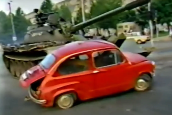 Дальше случилось то, что обычно бывает, когда танк сталкивается с легковушкой. Танк Илича зацепил «Фичу», проволок сколько-то метров, а затем разминулся бортами с автобусом. «Фичу» приложило об автобус и зажевало под гусеницы танка. Тот уехал дальше по своим танковым делам, а на дороге осталась «Фича» в форме блина, из которой владелец с мрачной физиономией выковыривал уцелевшие запчасти. Все это снимал оператор Жарко Плевник.