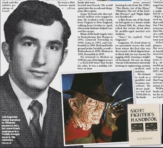 Карл Гугасян начал путь к славе в 15 лет, когда попытался ограбить кондитерскую лавку. За это его поместили в тюрьму для несовершеннолетних. Там Карл многое понял, в частности — что ограбление дело серьезное, и к нему надо подходить системно.Он отслужил в армии, где получил тактическую подготовку, а затем в университете Пенсильвании, где приобрел докторскую степень в области статистики и теории вероятности. Все эти навыки пригодились ему для нового занятия. Гугасян решил, что его призвание — грабить банки. Каждый налет он планировал как военную операцию. Он начинал с тщательной разведки, изучал карты районов, прилегающих к банкам. Чтобы удостоиться визита гангстера, банк должен был отвечать целому комплексу требований. Это должен был быть небольшой банк в небольшом городе, недалеко от леса, и обязательно с тропами, ведущими к автостраде. Грабеж совершался осенью или зимой, чтобы уйти по темноте — и соответственно, отбирались банки, работающие допоздна. С помощью математических выкладок Гугасян рассчитывал, когда в намеченном банке меньше всего людей и больше всего наличных денег. В банк он обычно врывался за несколько минут до закрытия, когда клиентов мало, а сотрудники расслаблены. На лице Гугасян носил устрашающие маски, отдавая предпочтение образу Фредди Крюгера. Дело было не только и не столько в устрашении. Из всех черт преступника жертвы отлично запоминали яркую, страховидную маску… и больше ничего.Он специально носил одежду большого размера, чтобы она скрадывала фигуру.