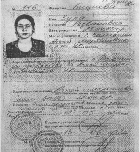 Удостоверение личности Зуры Бициевой. Эта девушка полностью соответствовала типичному портрету смертницы. Из неудачливой семьи (отец погиб в пьяной драке, когда она была маленькой), очень религиозная, очень послушная. Отправляясь на Дубровку, она рассчитывала вернуться домой и даже имела обратный билет из Москвы. Билет ей не понадобился.