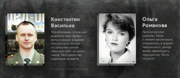 Первые часы хаоса, пока террористы не успели взять здание под контроль, а снаружи — не успели выставить оцепление, позволили многим сбежать, но тогда же произошли первые трагедии этих дней. В зал один за другим снаружи пришли два человека. Полковник Константин Васильев своей волей пошел в здание. Он счел, что его звание позволит ему спасти хотя бы кого-то, если он предложит себя в качестве ценного заложника взамен нескольких женщин и детей. Однако террористы просто его расстреляли. Девушка по имени Ольга Романова продемонстрировала такой же благородный порыв, который кончился так же трагически — узнав о захвате, она отправилась в театр… и начала публично стыдить Бараева и его боевиков. Подобные искренние порывы хорошо смотрятся в романах, но террористы просто убили девушку.