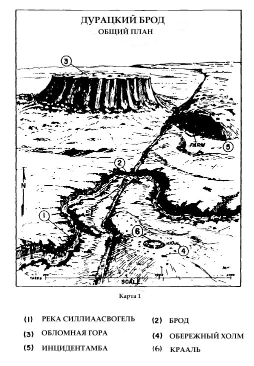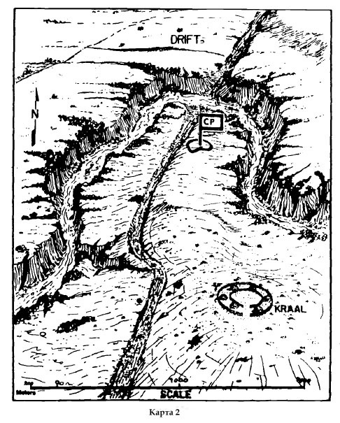 Где-то в двух километрах к северу от брода высилась скалистая столовая гора, а где-то в миле к северо-востоку находилась типичная для этих мест сопка — копье, покрытая кустами и усеянная булыжниками, крутая с южной стороны, но плавно спускающаяся с северной; с ближней стороны сопки располагалась ферма. Где-то в километре к югу от брода стоял выпуклый и ровный холм, напоминавший вывернутый наизнанку котлован, увенчанный редкими россыпями булыжников. На вершине располагался каффирский крааль, состоящий из нескольких глинобитных хижин с соломенными крышами. Между рекой и холмами на севере раскинулся открытый и практически ровный вельд; на южном берегу вельд был более холмистым, но столь же открытым. Вся местность была усеяна крупными термитниками.