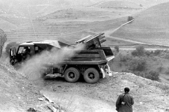 Один из знаковых образцов военной техники начала 90-х. Установки «Алазань» вообще-то нужны для защиты сельхозугодий от градовых облаков. Но во время распада СССР им вовсю прикручивали осколочно-фугасные БЧ, и в таком виде употребляли. Тут вот армяне увещевают азербайджанцев где-то под Шушей, но вообще их использовали повсеместно.