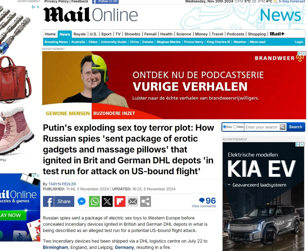 До этого «российские спецслужбы» поджигали торговый центр в Варшаве, покушались на главу концерна Rheinmetall и расстреливали автомобиль с украинским журналистом Анатолием Шарием и его женой.