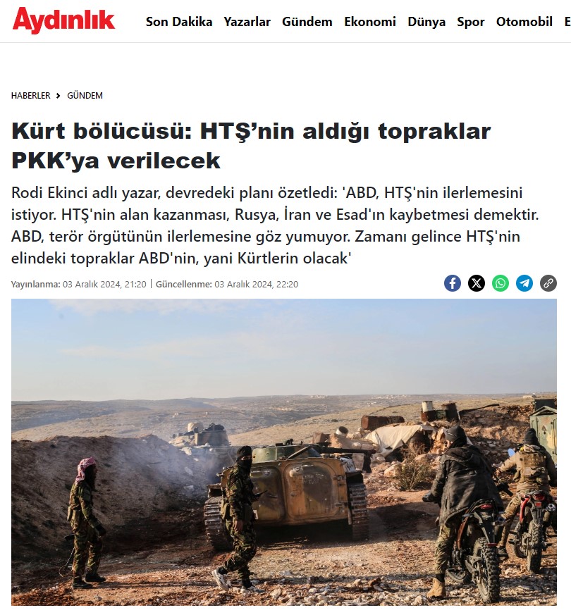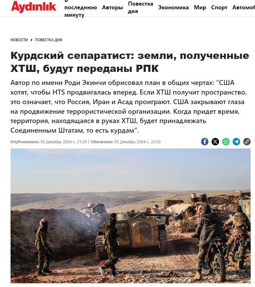 «курдский националист Роди Экинджи (Rodi Ekinci), называющий себя сепаратистом, опубликовал в социальных сетях комментарий о том, что США передадут Отрядам народной самообороны (YPG)/Рабочей партии Курдистана (РПК) регионы, оккупированные „Хайят Тахрир аш-Шам“ (ХТШ)*. По его словам, Америка во избежание конфронтации с Россией на поле боя позволяет террористическим организациям занять определенное пространство, после чего зачищает эту территорию от террористов вместе со своим союзником и передает эти земли „под его защиту“. „Все территории, занятые ХТШ*, будут принадлежать США, то есть курдам“, — отметил Экинджи.