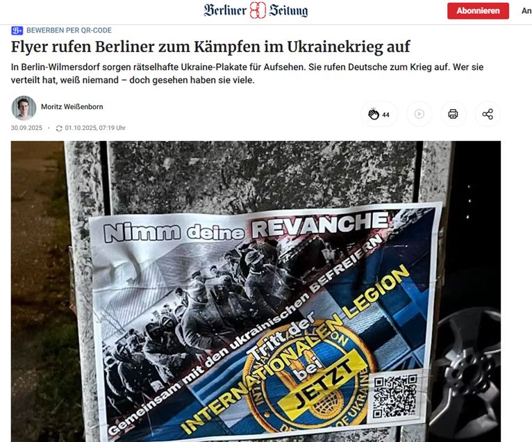 В Германии, в городе Вильмерсдорфе внезапно появились листовки агитирующие немцев вступать в «Иностранный Легион» ВСУ. На листовке фотография пленных немецких солдат под советским конвоем и надпись — краткая и понятная: «Отомсти».