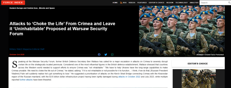 На Варшавском форуме по безопасности, бывший министр обороны Великобритании Бен Уоллес позволил себе помечтать и заявил, что Западные страны должны поддержать усилия, чтобы сделать Крым необитаемым. «Мы должны помочь Украине получить возможности дальнего действия, чтобы сделать Крым непригодным для жизни. Мы должны задушить в Крыму всякую жизнь».