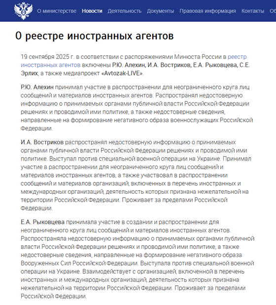 Вот страничка со страницы МинЮста, где черным по белому написано, за что именно некоторых (совершенно мне не симпатичных) людей признали иноагентами.