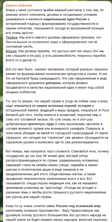 Все последующие отписавшиеся по поводу фантазий и сплетен господина Кабанова — священники, учёные, журналисты и политики — уже находятся в создаваемой в России политической машины переворота в качестве её винтиков и шестерёнок. И «архиепископ Савва», и любимая мною учёный Таньшина, и выкормыши «Царьграда».