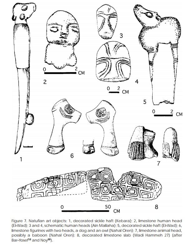У натуфийцев существовало собственное своеобразное искусство, во многом пересекающееся с искусством ориньяка и мадлена. На орудия наносился геометрический орнамент (сеть, зигзаги, волны). Есть несколько человеческих статуэток, сделанных из камня, но любимым предметом репрезентативного искусства, по-видимому, были животные, вырезанные из кости. Костяные рукоятки оформлены как фигурки животных или на них вырезаны изображения животных, чаще всего газелей и других копытных; гораздо реже — изображения людей.