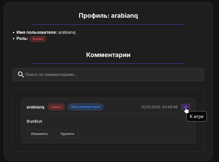 — Возможность оставлять комментарии на страницах игр. Поддерживается markdown, есть встроенный редактор. Если у вас премиум аккаунт, это будет отображаться всем. Вы также можете посмотреть все комментарии определённого пользователя.