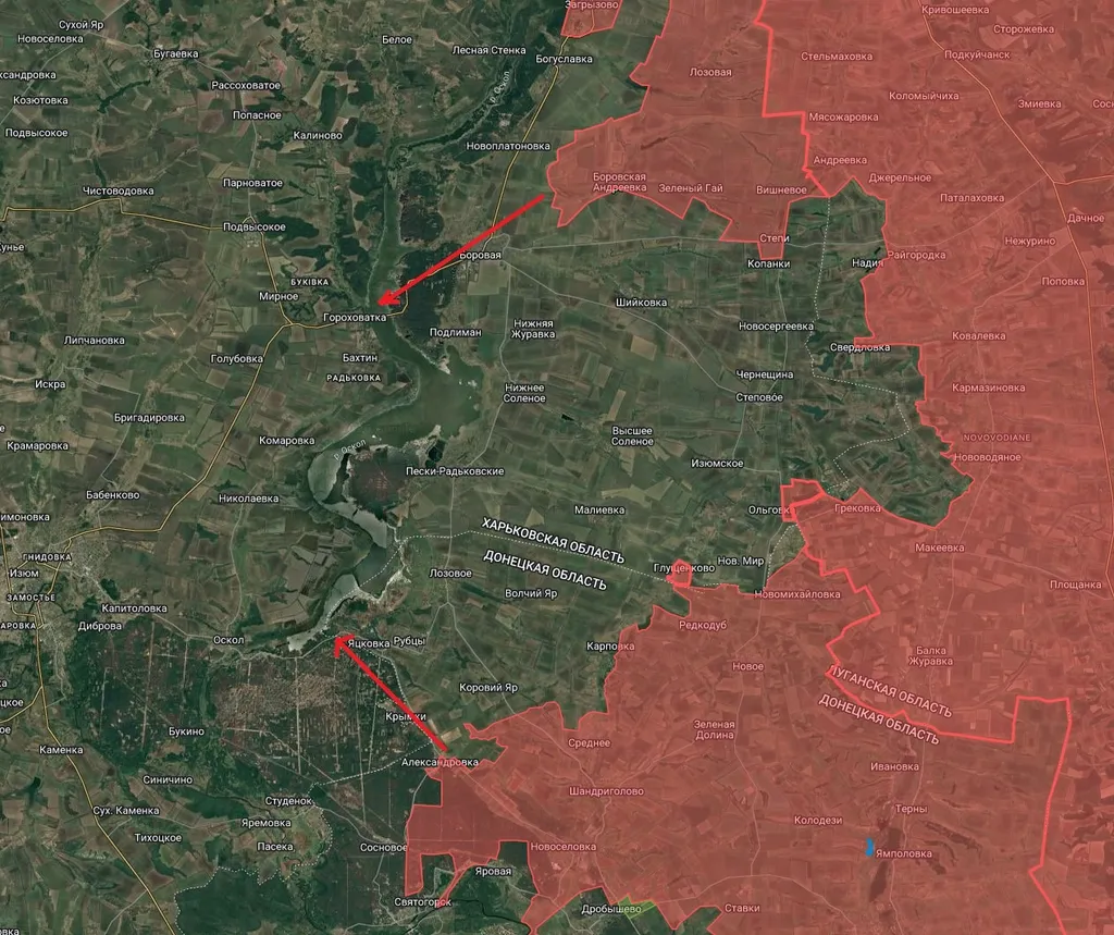 Это поможет не только в боях за Святогорск, в котором также идет активное продвижение, но и создаст предпосылки для ударов севернее по направлению к Боровая-Гороховатка и Крымки-Яцковка. Такая операция, в случае успеха, позволит сформировать гигантский котел, где противник будет окружен с трех сторон и прижат к Оскольскому водохранилищу.