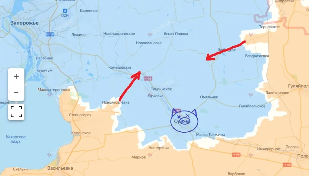 На Западе ВС РФ явно продвигаются в сторону шоссе Н-08 в районе Камышевахи. На востоке этого намечающегося грандиозного котла русские заняли Рождественское, от которого до второй главной трассы снабжения Орехова примерно 6-7 км.