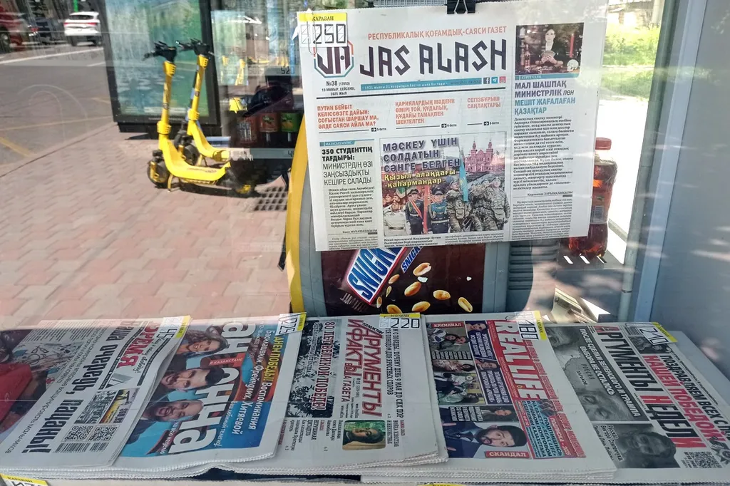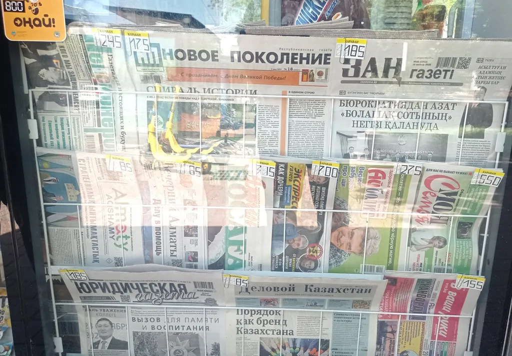 3. Довольно много тут и клонов российских издательских групп. Например, АиФ или «Комсомолка». Вверху — единственная увиденная мной газета с названием на латинице. При этом все заголовки и всё содержание — только на кириллице. Латиницы как языка больших текстов в Казахстане вообще не существует, она применяется в основном только в некоторых вывесках. Так что завиральная назарбаевская идея перевода языка на латиницу вызывает тут негласное, но сильное и всестороннее сопротивление.