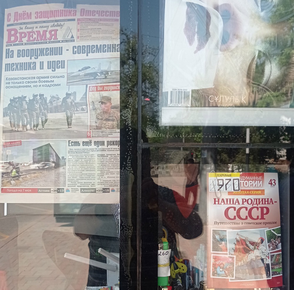 2. Более того — здесь нет никакой специально проводимой демонизации СССР и его истории. В продаже есть и вот такие журналы. Выше — газета «Время» с репортажами о казахстанской армии, на русском языке.