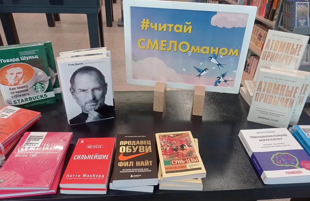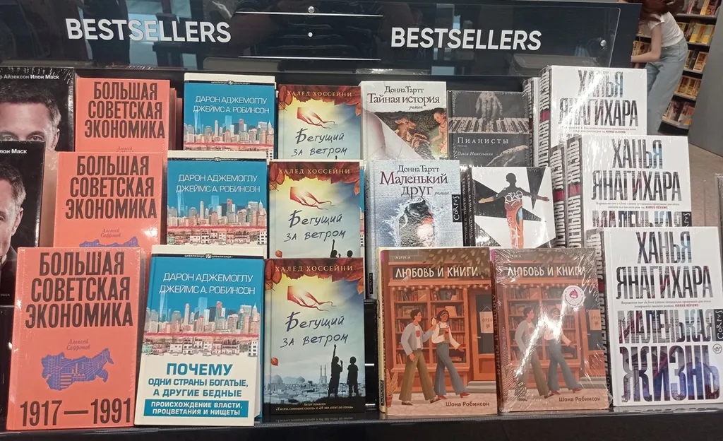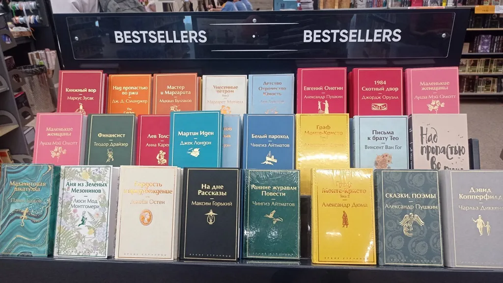 7. И третья стойка — с классической литературой. Здесь тоже на 100% русский, и можно увидеть, какие произведения популярны у читающих казахов.