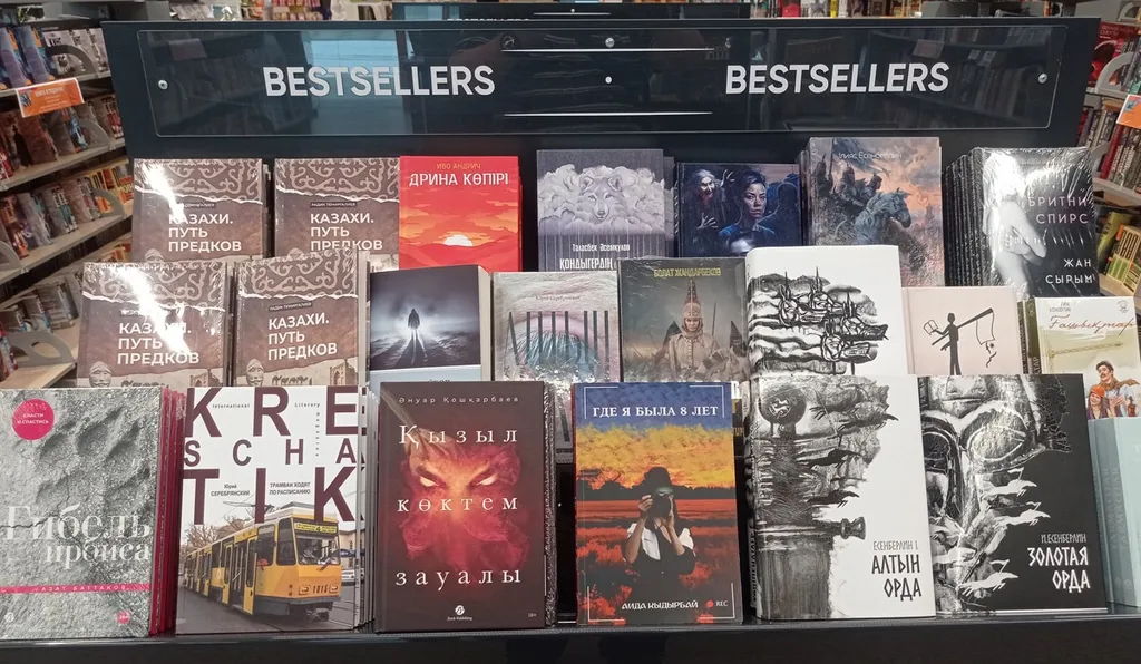 6. Витрина бестселлеров, с другой стороны. Здесь пять книг на казахском, остальные на русском. И что интересно — книга про киевский Крещатик — тоже на русском, хоть и с заголовком на латинице!