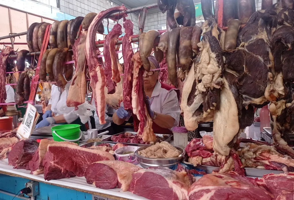 14. А это ряды свежего мяса — они делятся по видам: конина, баранина, говядина, свинина. Ряды конины и говядины самые большие. Ряд баранины несколько поменьше — хотя изначально я думал, что баранина тут самая популярная. Но нет, это оказалось совсем не так. А ряд свинины — и вообще небольшой, и там в основном славянские лица.