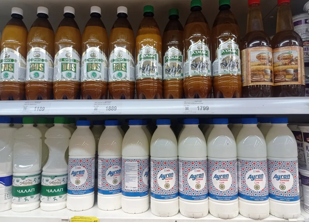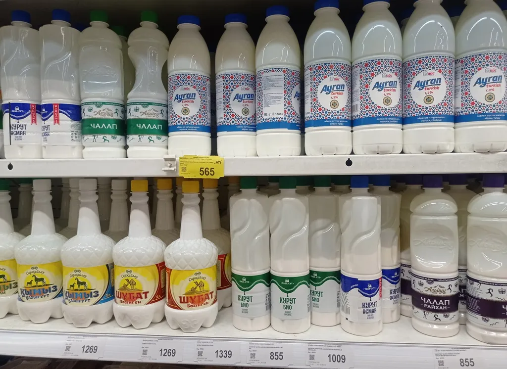 19. А вот что резко отличается от нашего ассортимента — так это молочка. Здесь очень много специфических её видов. Вот как тут: чалап, айран, шубат, курут, кымыз казыгурт.