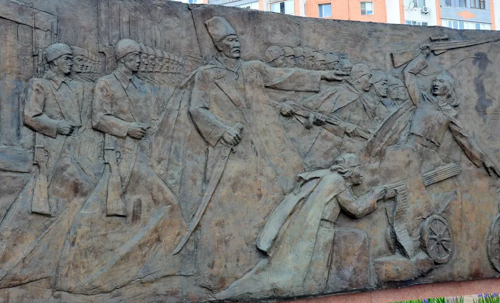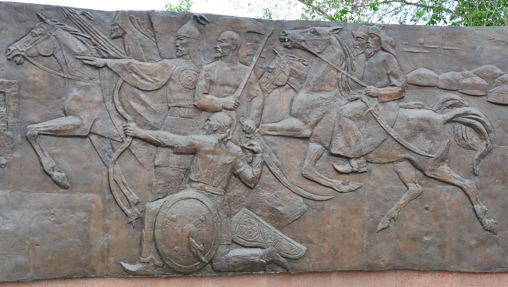 2. А за памятником полукругом расположены барельефы с военными сценками из разных периодов истории Казахстана. Посмотрим некоторые из фрагментов. Вот раннеказахские воины — возможно, эпохи войн с джунгарами.